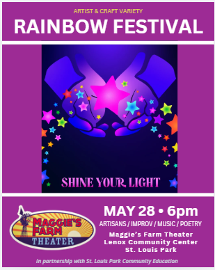 MAY 28, 6:00 - 9:00pm – Rainbow Festival | Pride Pre-Party. Celebrates identity and queer joy through performance art and craft with a variety of TC musical artists, musical artists, crafters and artisans, funny improv, poetical poets, and....a sing-along.